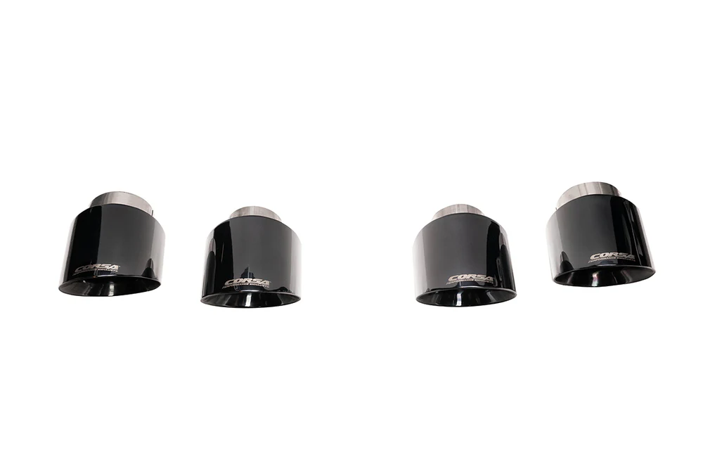 Dual-walled 304 stainless steel (available in polished and PVD black). Each tip is adorned with high-definition, precision laser engraving that provides unmatched detail. CORSA Performance C8 Corvette tip kits are designed to fit directly to CORSA Performance exhaust systems.